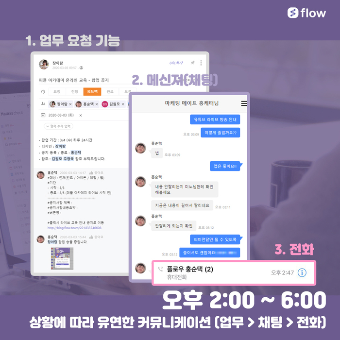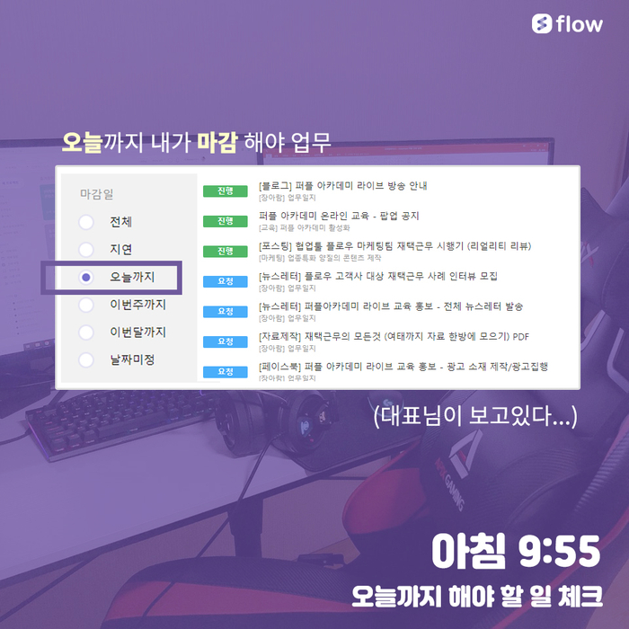 A. 플로우 에서는 모든 업무의 [담당자/마감일]이 명확하게 지정되어 있습니다. 출근과 동시에 오늘까지 내가 마무리 해야 하는 업무를 필터링 하여 우선순위를 파악합니다. 플로우는 개인의 업무 뿐만 아니라 모든 직원들의 업무를 투명하게 확인 할 수 있습니다. 즉, 대표님도 팀원들도 저의 업무를 확인 할 수 있습니다. 몇 년전 협업툴이 없는 회사에서 근무했을 때는, 본부장님의 출장 기간 동안 엑셀로 업무 일지 작성하여 오전 / 오후에 보고하는 절차가 필요했는데.. 번거로운 보고 절차 없이도 투명하게 업무를 관리 할 수 있어서 좋았습니다.
