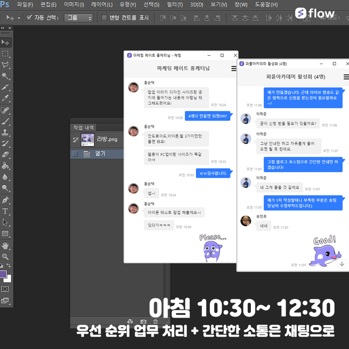 A. 오전에는 언제나 그러하듯 우선순위가 높은 업무 = (오늘까지 마감일을 절대 넘겨서는 안되는 업무)를 우선적으로 처리합니다. 내가 맡은 '업무에 대한 요건'들은 플로우에 명확하게 기록되어 있어서 혼선 없이 수월하게 업무를 진행 할 수 있었습니다. 업무를 진행하는 과정에서 질문이 있거나, 사소하게 업무 방향이 변경되는 경우가 있어 '실시간 채팅'으로 소통하였습니다. 재택근무 기간에는 가급적 더 빨리 회신을 하기로 약속을 했기 때문에 오전에 진행했던 간단한 업무 소통에는 전혀 문제가 없었습니다.