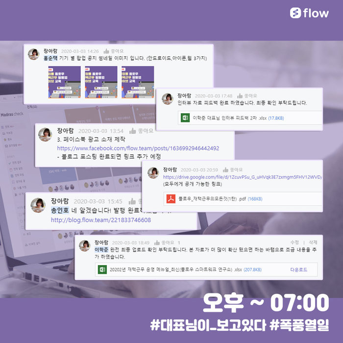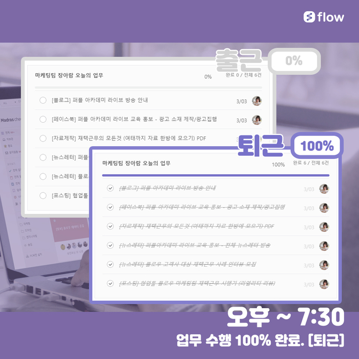 A. 실시간으로 모든 업무 처리 상태가 알림으로 뜨기 때문에 평소에 플로우 마케팅팀은 퇴근 시간에 따로 업무 보고 절차가 없습니다. 다만 재택근무 기간에는 평소보다 좀 더 철저하게 업무 보고를 하고 싶어서 [ 할 일 ] 체크 리스트 기능을 활용하여 직관적으로 보고를 했습니다. 업무 계획 100% 수행. 이로써 퇴근 완료!