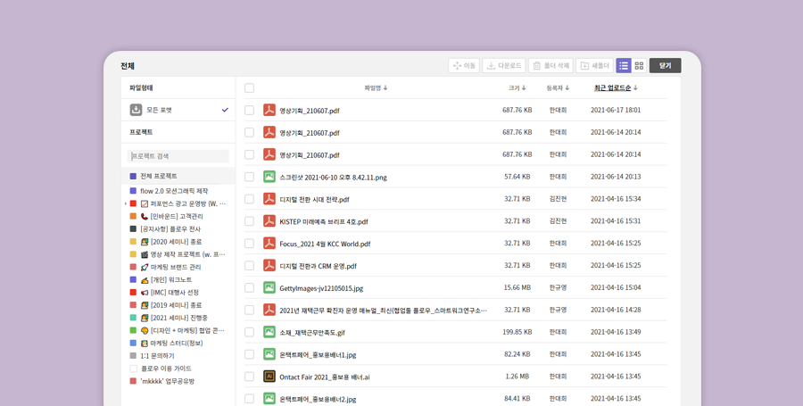 카테고리만 잘 분류해 놓으면 원하는 파일을 빠르게 찾을 수 있는데요. 플로우는 프로젝트별로 파일을 보관할 수 있어 찾아보기 편리합니다. USB나 외장하드 같은 관리 위험부담이 큰 저장장소가 아닌 클라우드로 저장할 수 있어, 언제 어디서나 다운로드가 가능하죠.