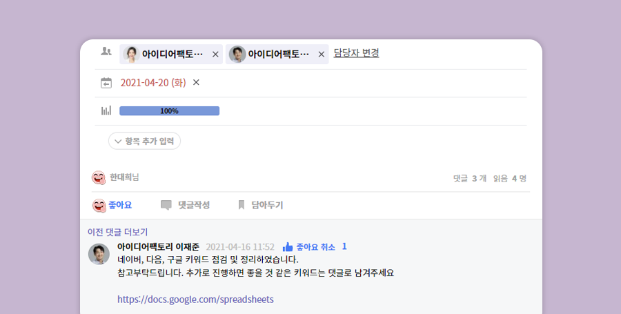 업무를 진행하는 데 있어 결과만큼이나 중요한 것이 히스토리입니다. 히스토리를 알고 있다면 기회비용을 줄일 수 있는데요. 플로우는 업무에 대한 히스토리를 댓글 형태로 남길 수 있습니다. 프로젝트별, 업무별로 다른 팀과 논의했던 히스토리, 외주 업체와 공유했던 내용들은 모두 볼 수 있습니다.