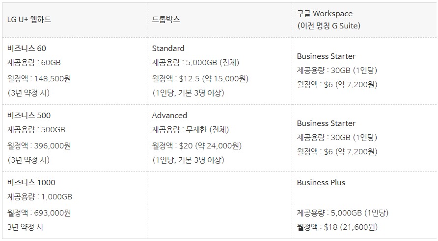 여러 웹하드 중에 기업용으로 사용하기 좋은 웹하드 3종을 비교해 봤습니다. 국내 제품인 LG U+ 웹하드와 해외 제품인 드롭박스, 구글 Workspace입니다.