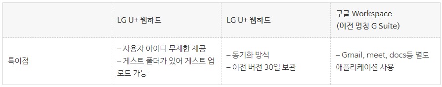 LG U+ 웹하드, 드롭박스, 구글 워크스페이스 사이트 갈무리