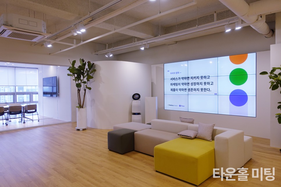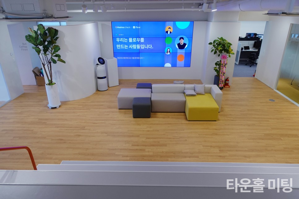 플로우는 한 달에 한 번 전직원이 모여 그간의 성공담과 실패담을 공유는 📅'월간 경영 포럼' 이라는 특별한 사내 문화가 있어요. 서로의 경험과 고민을 함께 공유하며 자신의 업무 외 다양한 분야에 대한 안목을 넓히는 플로우만의 협업 문화에요! 넓은 타운홀 미팅 공간은 플로우 팀의 전직원 소통을 위한 홀로 꾸며져 더 자유로운 회사 분위기를 연출했어요!
