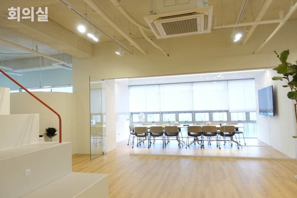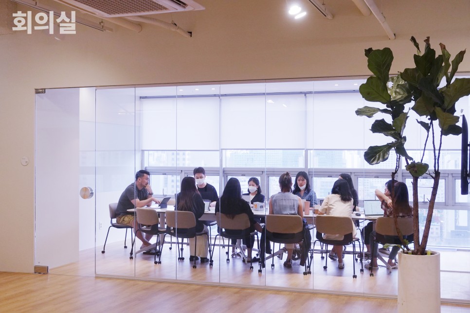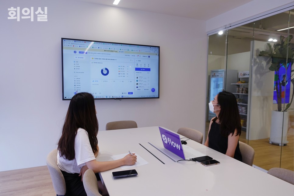 통유리를 활용한 뻥 뚫린 폴딩도어 인테리어가 돋보이는 플로우의 회의실입니다. 덕분에 답답하고 권위적인 분위기를 탈피하고 개방된 의견을 표현할 수 있는 자유로운 회의 공간이 되었어요! 구글 시계로 유명한 '⏲타임타이머'를 활용해서 회의시간을 정해 놓고 집중력 있게 시간 관리를 하고 있답니다! 회의 공간에서 플로우의 팀원들은 자신의 생각을 다른 팀원에게 공유하고 의견을 듣으면서 함께 성장하는데, 그 분위기가 얼마나 즐거운지 직접 경험해 보신다면 놀라실거에요!