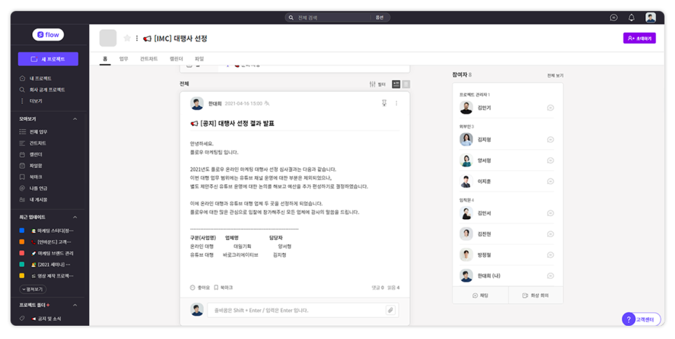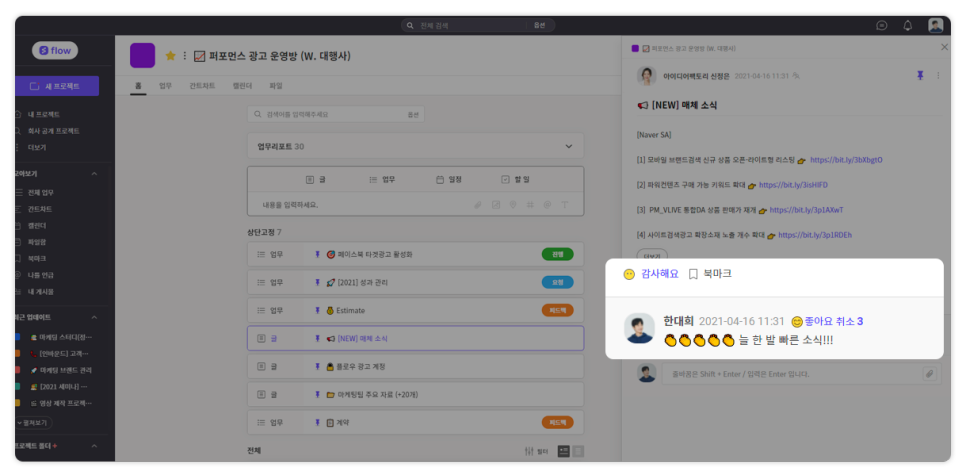대행사는 우리의 일을 도와주는 고마운 곳입니다. 갑과 을의 구도로 보면 안되는 이유죠. 협업툴 플로우는 마케팅 조직에서 사용하면 좋은 업무툴 중 하나 입니다. 대행사의 입장에서도, 인하우스 마케팅 부서에서도 사용하기 좋죠. 성공적인 협업을 통해 매출 달성과 KPI 달성이라는 두 마리 토끼를 잡으셨으면 좋겠습니다.