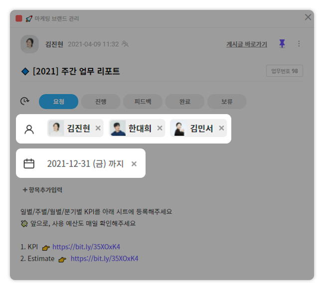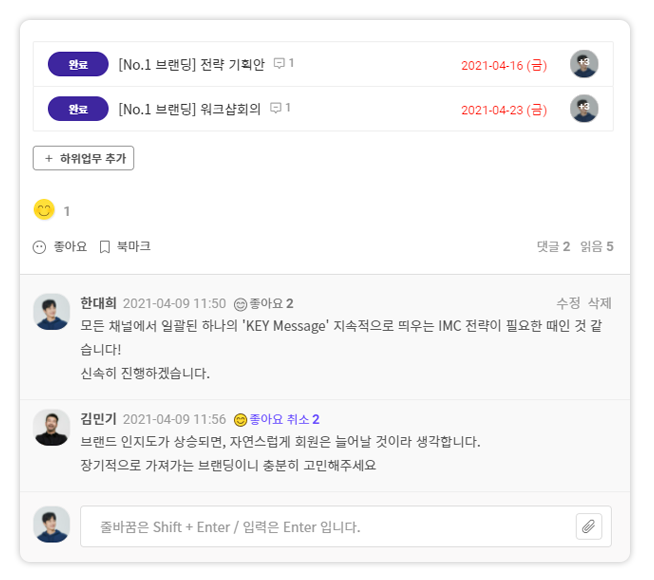그래서 파일은 물론이고 업무 히스토리도 모두 기록에 남아야 합니다. 대행사 직원이 바뀌거나 내부 직원이 바뀌더라도, 기록이 남아있다면 별도의 인수인계 없이 모든 히스토리 파악이 가능하겠죠!