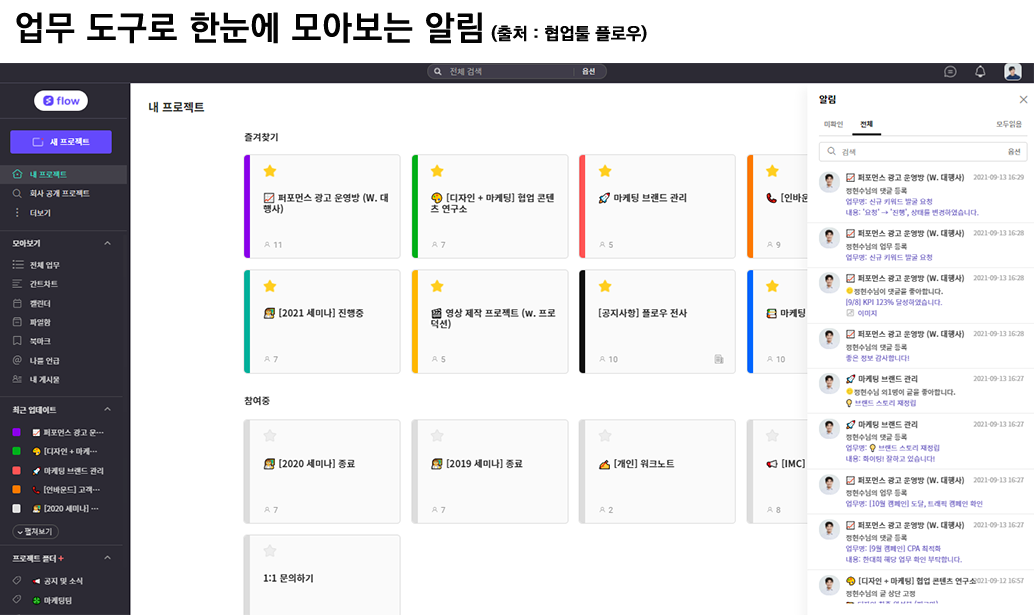 업무 도구입니다. 특히 플로우와 같은 협업 도구는 프로젝트를 중심으로 각 분야별 전문가들이 유기체처럼 협업할 수 있게 합니다.