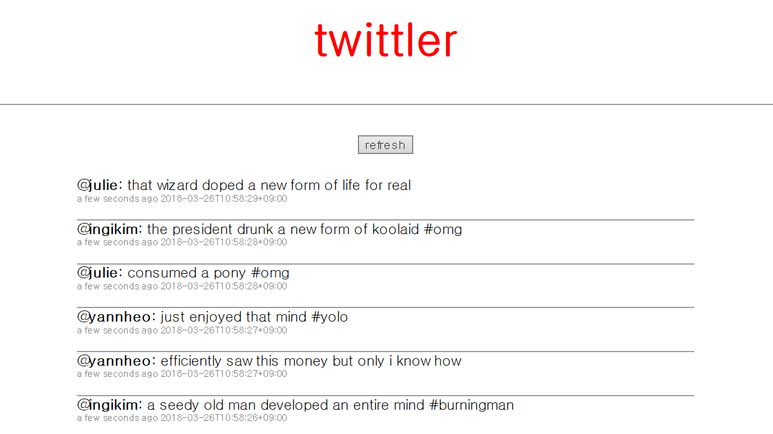 - *twittler 를 만들었을 때가 가장 기뻤어요. 뭐라고 말로 표현하기는 어려운 감정인데, 실제로 눈에 보이는 걸 만들었을 때 성취감이 크더라구요. 그 성취감이 동기부여가 되어서 더 열심히 했던 거 같습니다.