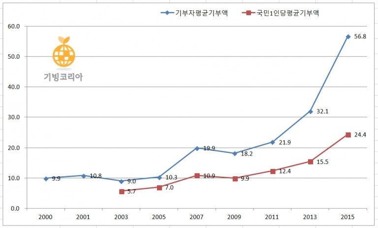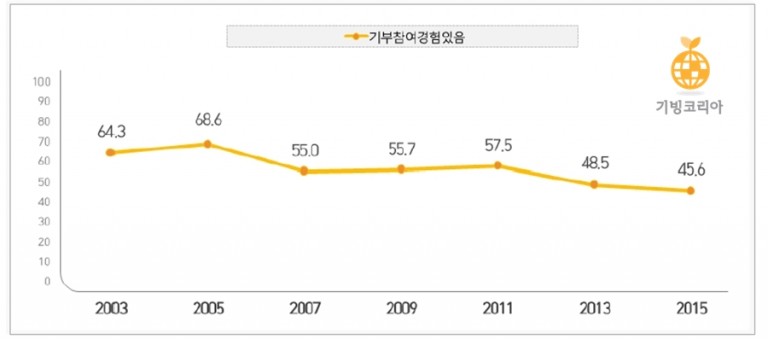 2016년 '아름다운 재단' 산하 '기부문화연구소'의 발표에 의하면 2015년 대한민국 국민 중 기부를 하는 사람의 비율은 45.6%로 지난 2013년 조사 때 나왔던 48.5%보다 2.9%가량 낮아졌으며 2005년 조사에는 68.6%였으니 10년 사이에 무려 23%가 낮아진 겁니다.