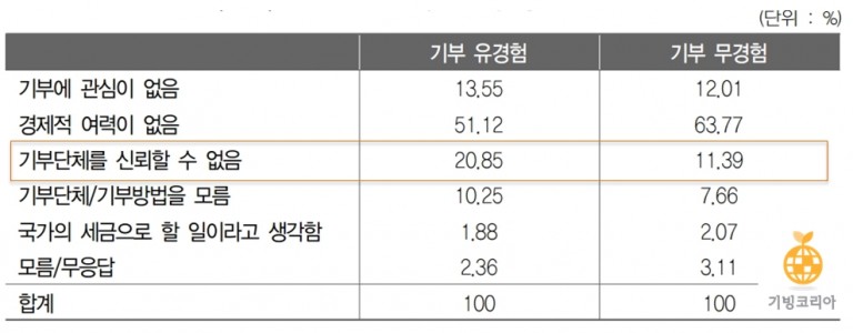 그렇다면 기부를 하지 않는 이유는 무엇일까요? 해당 연구소에서 발표한 자료에 따르면 가장 큰 이유는 경제적인 이유였습니다. 그다음으로 기부단체를 믿지 못한다는 답변과 기부에 관심이 없거나, 기부 방법을 알지 못해서라는 답변이 가장 많았습니다.