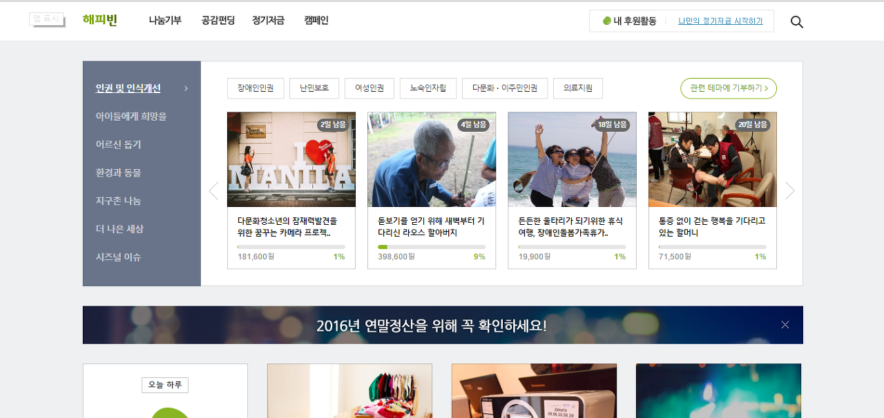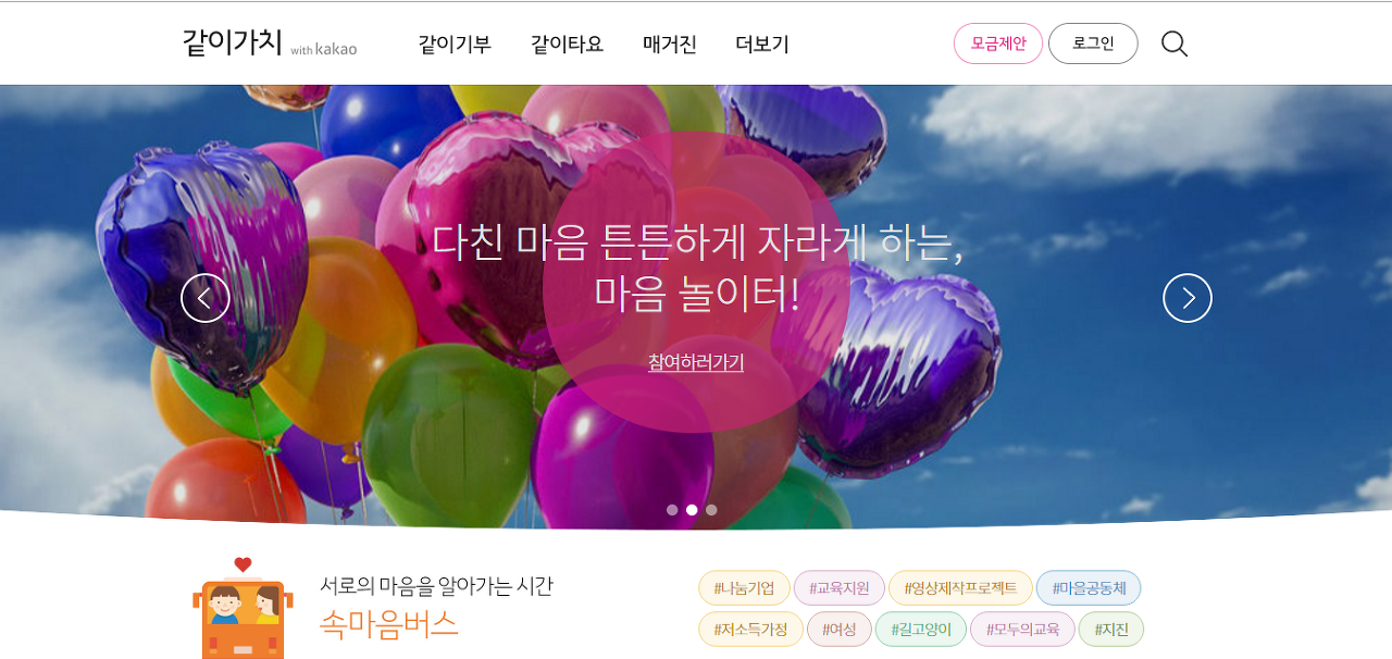 네이버가 하면 다음도 해야겠죠? 2007년 12월 다음도 기부 관련 서비스가 생깁니다. 다음 아고라 내의 희망모금 메뉴로 시작되었죠. 아고라는 네티즌들이 각종 청원을 위해 만들어진 서비스인데 그 안에서 모금활동이 시작되었고 그걸 메뉴화 시킨 겁니다. 2011년 4월 희망해라는 이름으로 독립 서비스로 나왔고 카카오와의 합병 이후 2016년 3월 현재의 같이가치가 되었습니다.