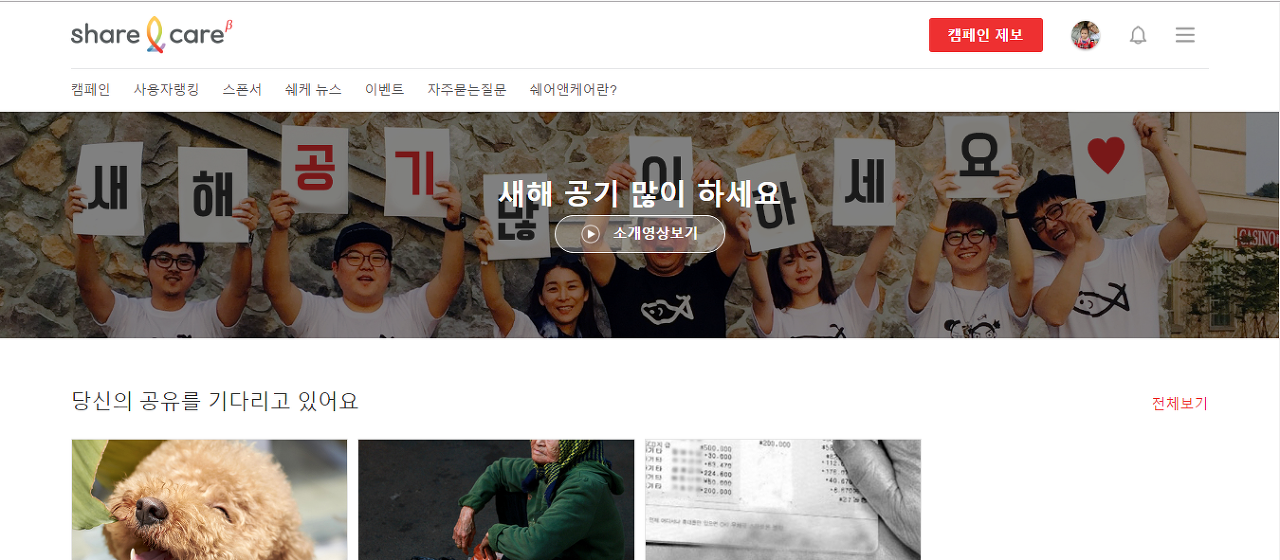 지금까지 나왔던 서비스들은 모두 포털이라는 자산을 가지고 시작했다면 마지막으로 소개해드릴 쉐어앤케어는 유일한 스타트업 서비스입니다. 세상에서 가장 쉬운 기부 플랫폼이라고 칭하는 쉐어앤케어는 2015년 7월 베타 서비스를 시작했으니 이제 1년 반이 조금 더 되었네요.