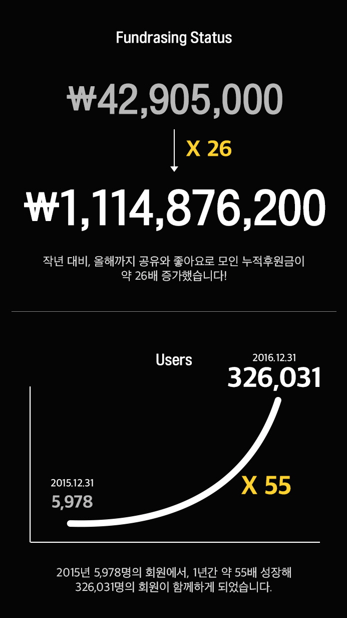 실제 쉐어앤케어가 2016년을 결산하며 발표한 자료를 보면 2015년 대비 2016년에 큰 성장을 이루었음을 알 수 있습니다. 2017년 현재 누적 사용자는 41만 명이며 누적 기부액은 14억을 넘었습니다. 이게 작은 스타트업이 이루어낸 성과라고 생각하면 대단하다고 말하지 않을 수 없을 것 같네요.