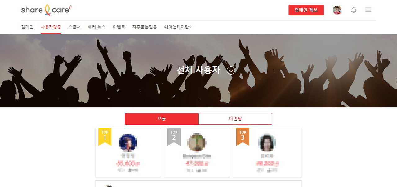 쉐어앤케어는 게이미피케이션을 적극적으로 활용하는 모습입니다. 매일, 그리고 매월 공유를 통해 가장 많은 좋아요를 얻은 사용자의 랭킹을 보여주고 있습니다. 가수나 정치인, 다양한 인플루언서들이 상위에 랭크되는 모습을 볼 수가 있네요.
