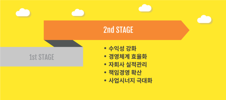 이제 옐로모바일은 새로운 도약을 위한 두 번째 스테이지로 진입하려고 합니다. 수익성을 강화하고, 경영체계를 효율화함과 동시에 관련 역량을 강화합니다. 아울러 체계적으로 자회사 실적을 관리하며, 이에 따른 책임 경영철학을 확산시키고, 이를 통해 사업 시너지를 극대화하고자 합니다.