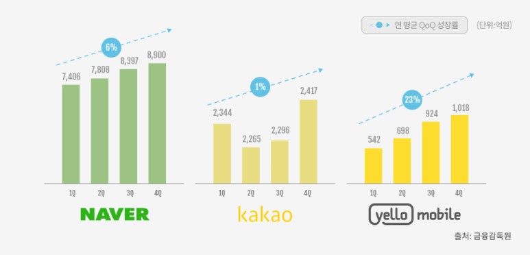 네이버, 카카오, 옐로모바일의 2015 분기별 매출 비교