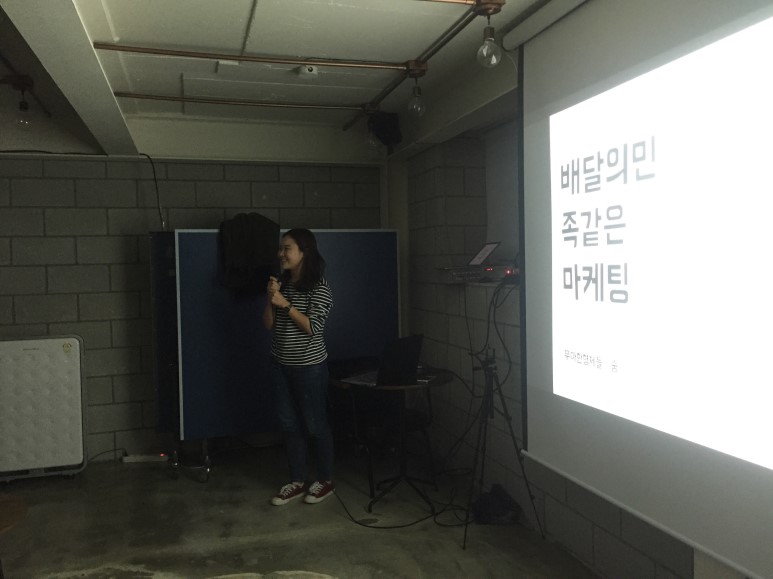 스타트업 야간자습에서 발표중인 배달의민족 마케터 '숭'님