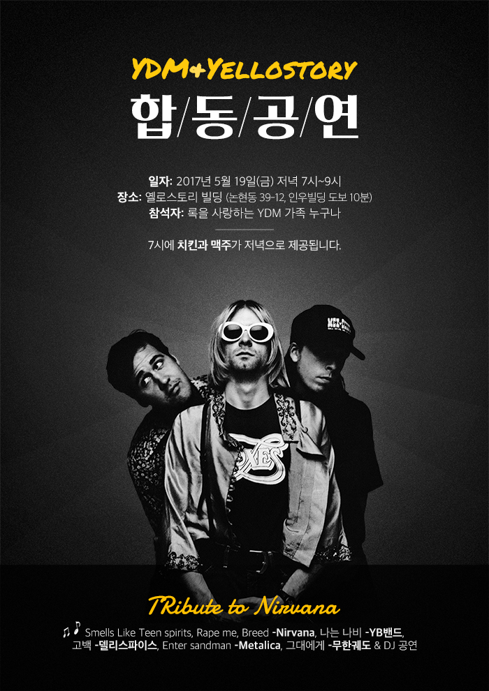 특히 이번 옐스데이는 전설적인 록 그룹 너바나의 리더 커트 코베인 추모 공연이 진행됐는데요, YDM 임원 및 옐로스토리 임직원이 ‘락 스피릿’ 아래 하나돼 잠시 동안 업무스트레스를 잊고 흥겨운 시간을 보냈습니다. (함정은 금요일 퇴근 후!! 였다는 것…물론 행사 참석은 100% 자유) (소근소근)