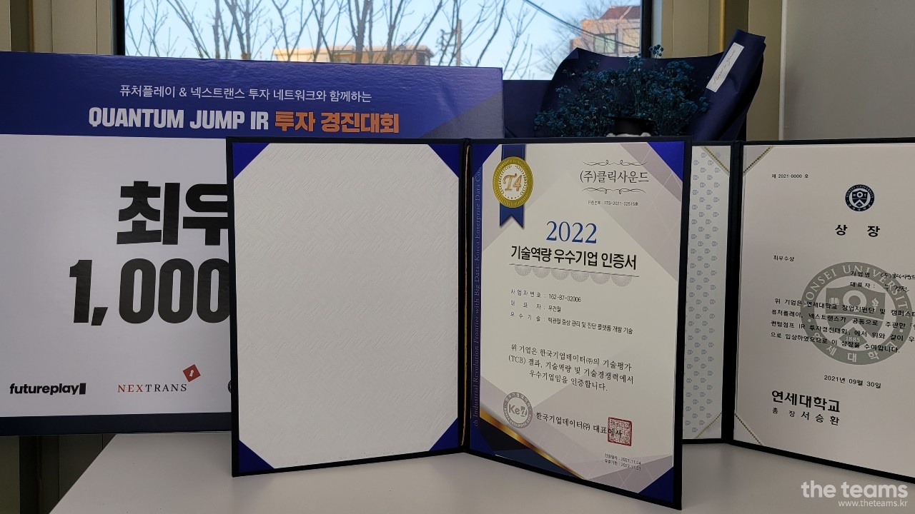 정부의 초기창업패키지 우수기업, 연세대학교 창업캠프 우선지원 회사, Quantum Jump IR 최우수상, 기술역량 우수기업 인증 등