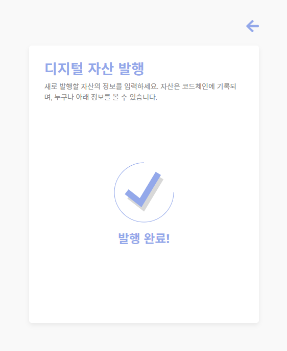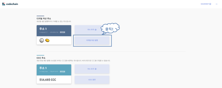 1. 디지털 자산 발행을 위해서는 디지털 자산 주소 행에 있는 ‘디지털 자산 발행’ 버튼을 클릭합니다.