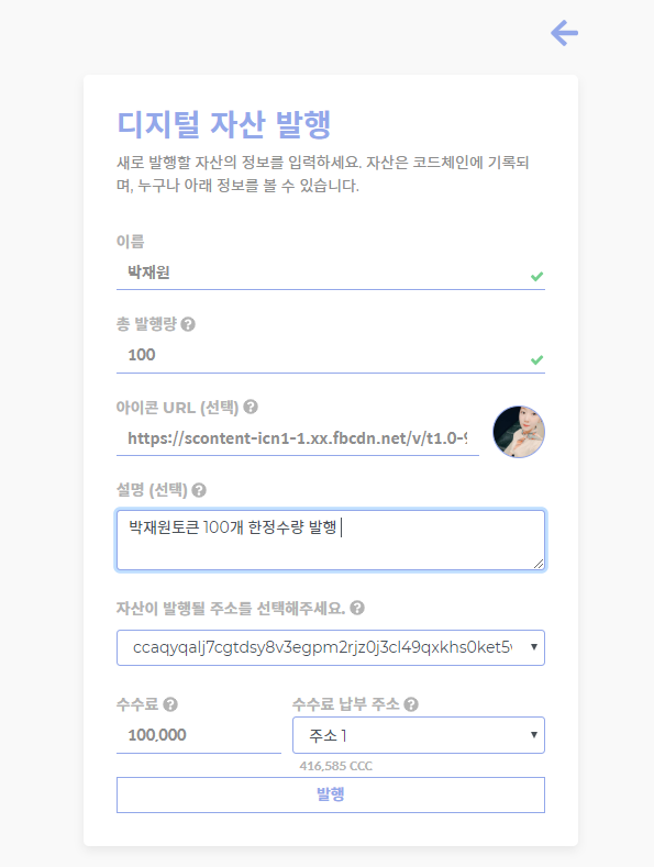 2. 디지털 자산 발행 창이 아래와 같이 나타나면, 관련 정보와 자산이 발행될 주소를 적어주세요.