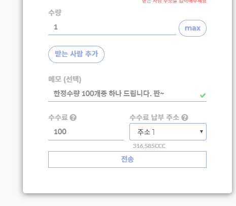 자산 목록에 전송하실 자산을 클릭하시면, 오른쪽과 같은 창이 뜹니다. 받는 사람 주소를 입력하시고 전송버튼을 클릭해주세요.