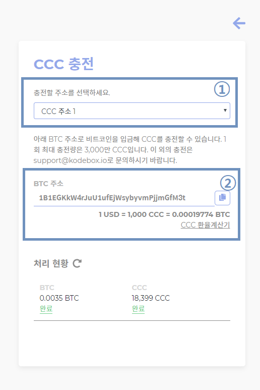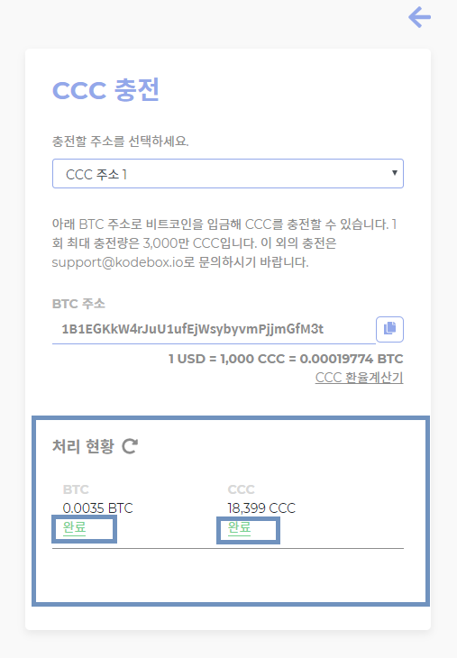 셋째, 송금이 완료되면 처리현황에 CCC와의 교환내역이 나타나고, 충전하기로 선택했던 주소에 일정 비율대로 CCC가 충전됩니다.