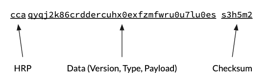위의 주소는 “ccc”, “qr5…yeq”, “jjd6g0” 세 부분으로 나눌 수 있다. “ccc”는 Bech32의 HRP이다. 앞의 두 글자 “cc”는 네트워크 아이디를 나타내고 세 번째 글자인 “c”는 이 주소가 PlatformAddress임을 의미한다. “qr5…yeq”는 버전과 Account ID를 인코딩한 값이다. 주소의 마지막 6개 문자 “jjd6g0”은 체크섬이다. HRP와 체크섬은 검증 이후로는 쓰이지 않는다. 코드체인 내부적으로는 Account ID만 사용한다.