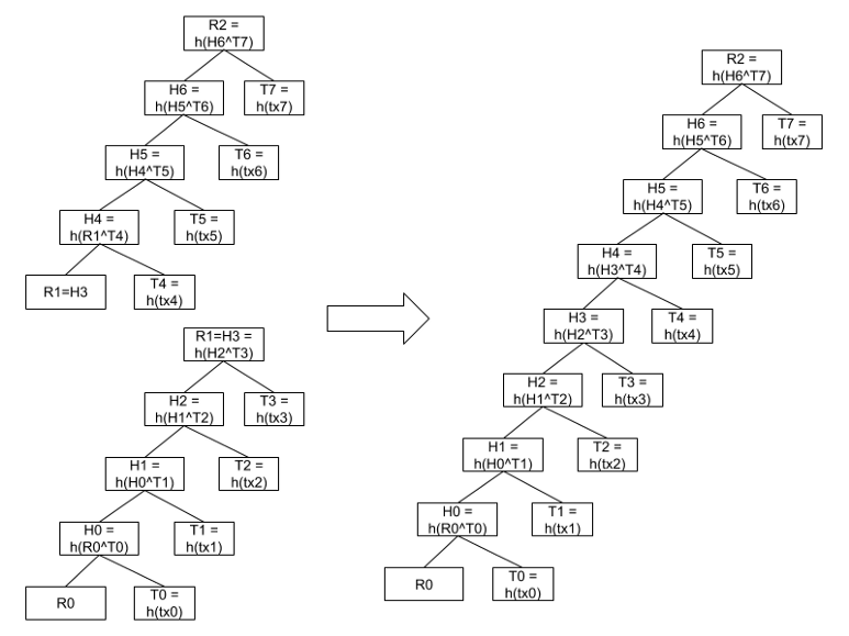 그래서 우리는 왼쪽으로 치우친 Skewed Merkle Tree를 사용하기로 결정했다. Skewed Merkle Tree에서는 전 블록의 root위에 현재 블록의 트랜잭션들을 이용해 새 tree를 만들어 지금까지 실행된 전체 트랜잭션 목록을 담는 해시를 빠르고 가볍게 생성할 수 있다. 즉, 전체 트랜잭션 목록을 incremental 하게 만들 수 있고, 만드는데 드는 시간과 메모리는 트랜잭션 수에 선형적으로만 비례한다. 게다가 우리가 관심있는 것은 검증을 위한 root값 뿐이기 때문에 사용하는 메모리는 트랜잭션 개수와 상관없이 상수배만큼 사용하도록 최적화할 수 있다. 실제로 코드체인에서 사용한 코드는 다음과 같이 간단하다.