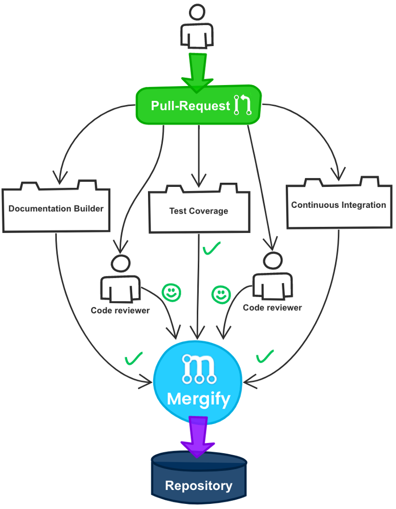 이런 상황에서 병합 작업자의 부담을 줄이고, Travis CI의 작업량 부담을 줄여 병합 지연을 줄이고, 결과적으로 팀의 능률을 향상시키기 위해서 저희 코드체인 엔진 팀에서는 Mergify 를 도입하게 되었습니다. Mergify 는 GitHub과 연동되는 병합 관리 서비스로, 정책을 저장소에 포함된 .mergify.yaml 파일로 유연하게 설정 가능하고, 설정된 정책에 따라 조건에 맞는 풀 리퀘스트의 자동 병합을 진행하거나 중단할 수 있고, 다양한 동작들을 자동으로 수행할 수 있습니다.