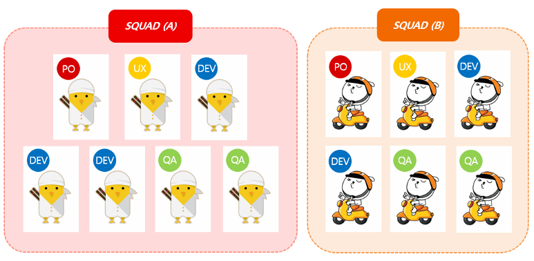 스쿼드는 Full-Stack Team으로 제품 개발에 필요한 모든 Skillset으로 멤버가 구성됩니다. 기능 조직이 각 멤버가 소속된 팀의 서로 다른 KPI나 목표를 중심으로 움직인다면, 스쿼드는 전사적으로 중요한 비즈니스적 방향성에 맞춰 공동의 목표 달성을 위해 함께 움직이게 됩니다.