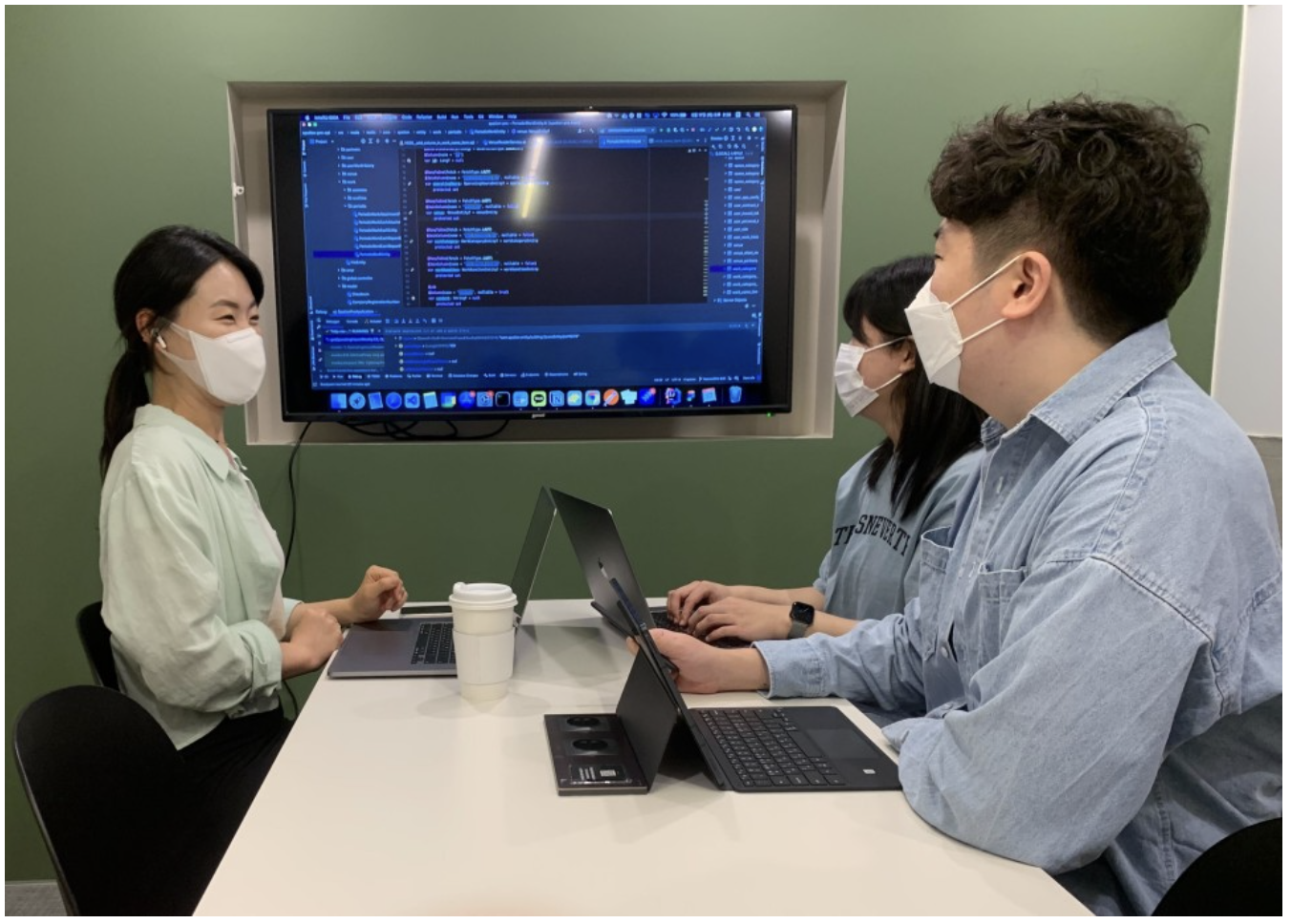 대화를 많이 하는 편이구요. 기능이 나눠져 있어도 개발 특성상 완전히 분리되는 게 아니라서 서로가 어디를 개발하고 있는지 뭐가 필요한지에 대한 소통이 필요한데요, 그런 부분도 잘 협업이 되고 있습니다.