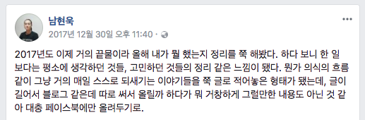 2017년도 이제 거의 끝물이라 올해 내가 뭘 했는지 정리를 쭉 해봤다. 하다 보니 한 일 보다는 평소에 생각하던 것들, 고민하던 것들의 정리 같은 느낌이 됐다. 뭔가 의식의 흐름같이 그냥 거의 매일 스스로 되새기는 이야기들을 쭉 글로 적어놓은 형태가 됐는데, 글이 길어서 블로그 같은데 따로 써서 올릴까 하다가 뭐 거창하게 그럴만한 내용도 아닌 것 같아 대충 페이스북에만 올려두기로.