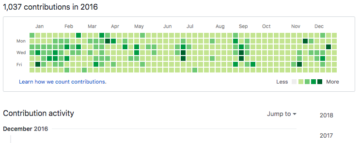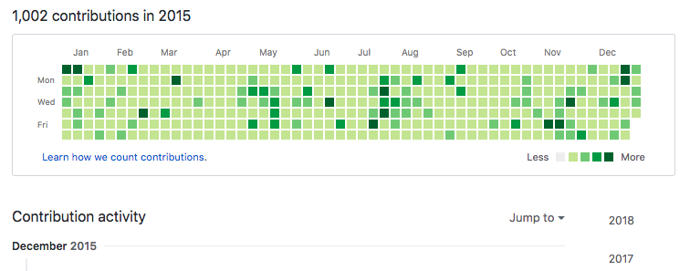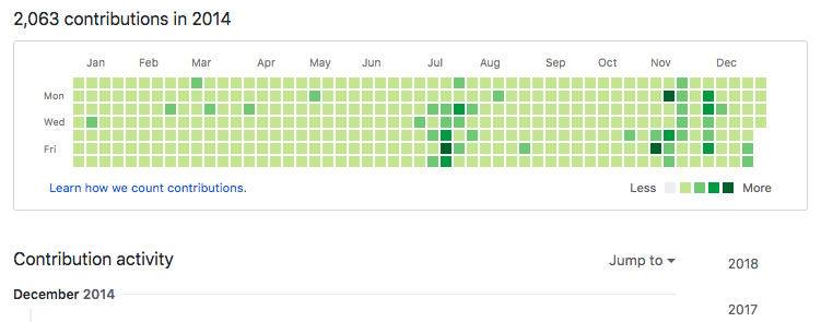 살짝 존 레식의 깃헙을 살펴봅시다. 주소는 https://github.com/jeresig 인데요. 몇년치 커밋로그를 살펴 봤습니다.