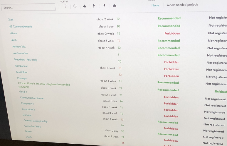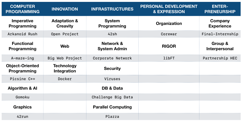 본 과정은 크게 컴퓨터 프로그래밍, 혁신, 인프라, 자기계발, 기업가정신 — 5가지 카테고리와 카테고리별로 세부적인 분야로 나눠지고, 분야별로 여러 Tier로 나뉜 프로젝트 문제가 있다. 카테고리별 분야는 아래 표를 참고하자. (참고로 에콜에는 없지만 EPITECH에는 영어 글쓰기나 발표 수업도 있다고 한다.)