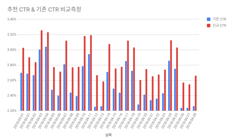 신규 추천시스템의 CTR과 기존 시스템의 CTR을 비교