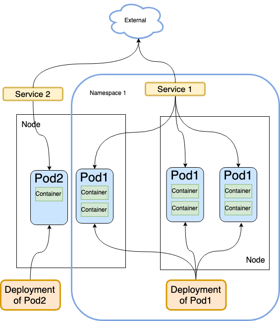 1과 2 두 가지를 서비스하고 있으며 1은 3개의 Pod로 2는 1개의 Pod로 서비스하고 있습니다. Deployment가 Pod의 수와 상태를 관리하고 있고 1번 서비스는 Namespace 1로 논리적으로 분리돼 있습니다. 위 그림에서는 Service가 모두 외부로 연결되지만 실제로는 그렇지 않은 Service도 존재하고 연결 방법도 달라질 수 있습니다. 이에 관해서는 포스팅이 너무 길어지는 관계로 생략하도록 하겠습니다. 중요한 개념이니 모르신다면 꼭 개인적으로 알아보시길 바랍니다.