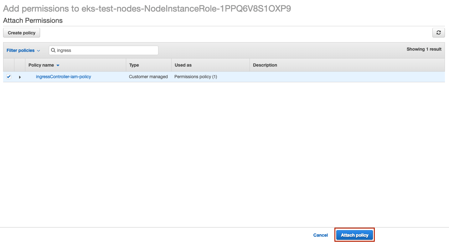 이제 ALB ingress Controller가 생성됐습니다. 하지만 ALB ingress Controller가 실제로 ALB를 생성하고 관리하기 위해서는 권한이 필요합니다. ALB와 관련된 권한을 작업자 노드의 IAM에 추가해 보도록 하겠습니다.