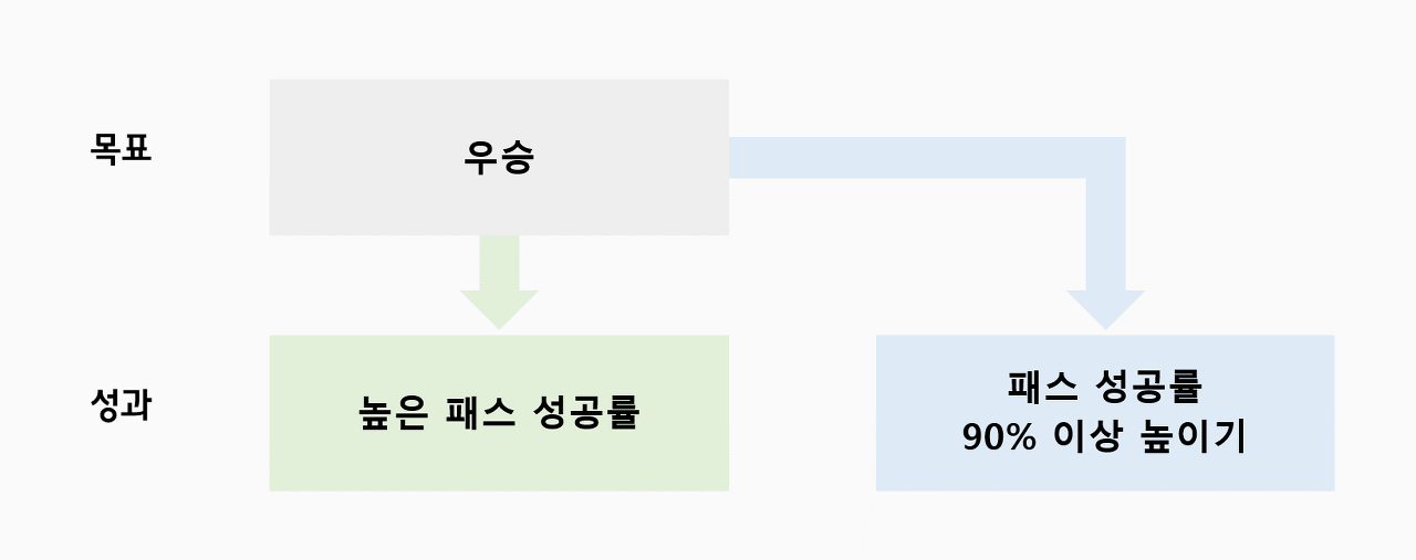 예를 들어, 평소 패스 성공률이 낮아 번번이 시합에서 졌던 한 축구팀있다고 가정하자. 이 축구팀이 우승을 목표로 세웠다면 당연히 훈련으로 패스 성공률을 높였다는 성과를 달성해야 할 것이다. 그렇다면 우승이라는 목표를 이루기 위해 성과를 '높은 패스 성공률'로 정하면 될까. 우리는 아니라고 생각한다.