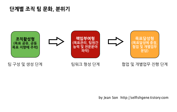 동기부여, 공동 목표 지향 → 팀원간 역량 및 전문분야 파악, 책임 및 역할 분담 → 협업과 개별업무 동시 진행
