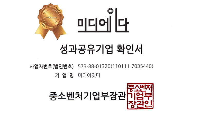 브랜딩 마케팅 전문기업 ㈜미디어잇다가 중소벤처기업부에서 인증하는 ‘성과공유기업’에 선정됐다.