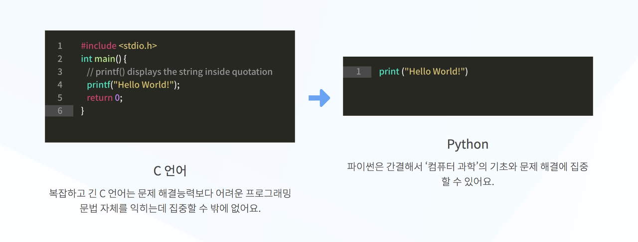 물론 파이썬이 무조건적으로 C보다 좋은 건 아니다. 파이썬 프로그램은 C 프로그램보다 느리기 때문에 특정 업무에는 적합하지 않다. 하지만 그런 건 지금 신경 쓸 필요가 없다. 첫 프로그래밍 언어로 "컴퓨터적인 사고력"을 익히고 나면 새로운 언어를 배우는 것은 어렵지 않기 때문에, 일단은 배우기 쉬운 언어로 시작해라.