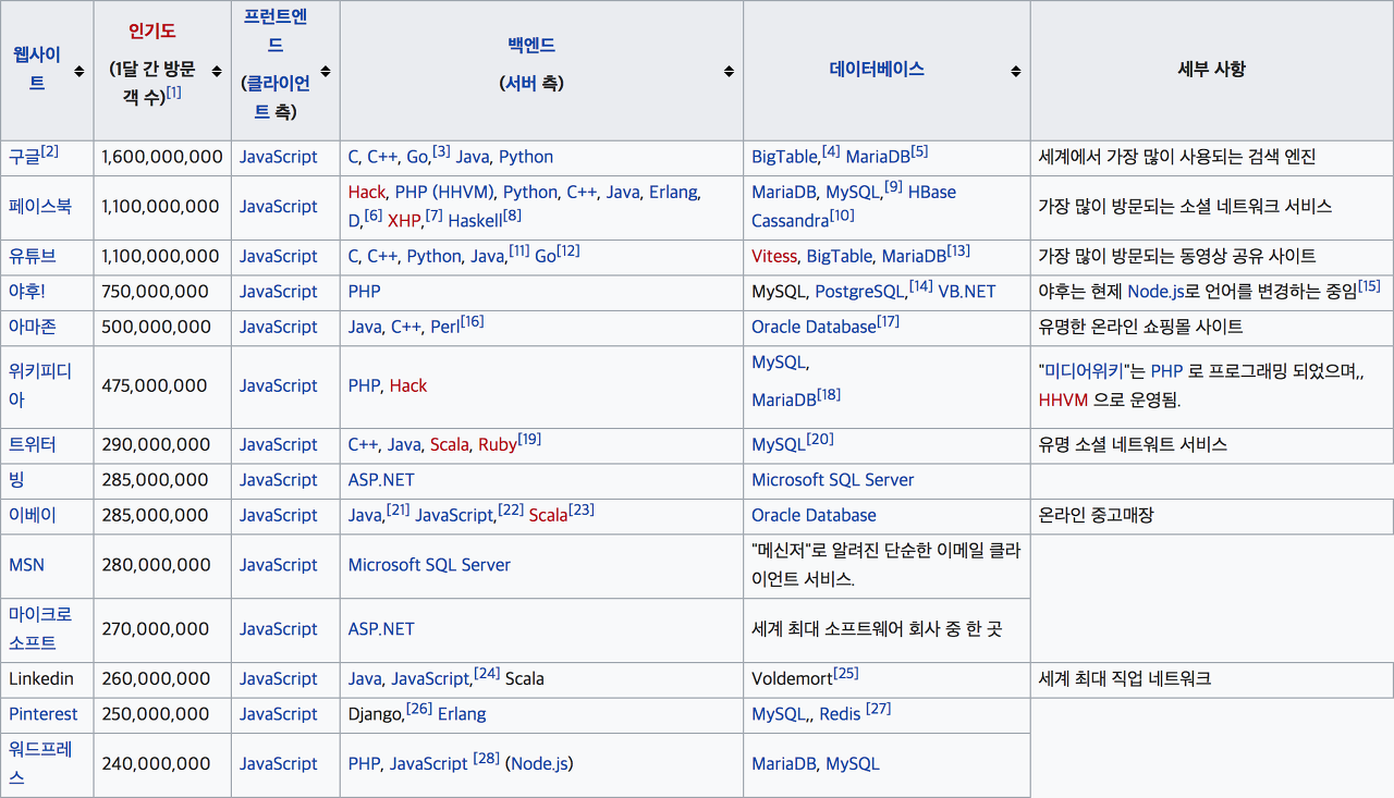 시장에서 필요로 하는 언어를 배우는 게 좋다. 세계에서 가장 큰 웹사이트들은 어떤 기술을 사용하는지 살펴보자: