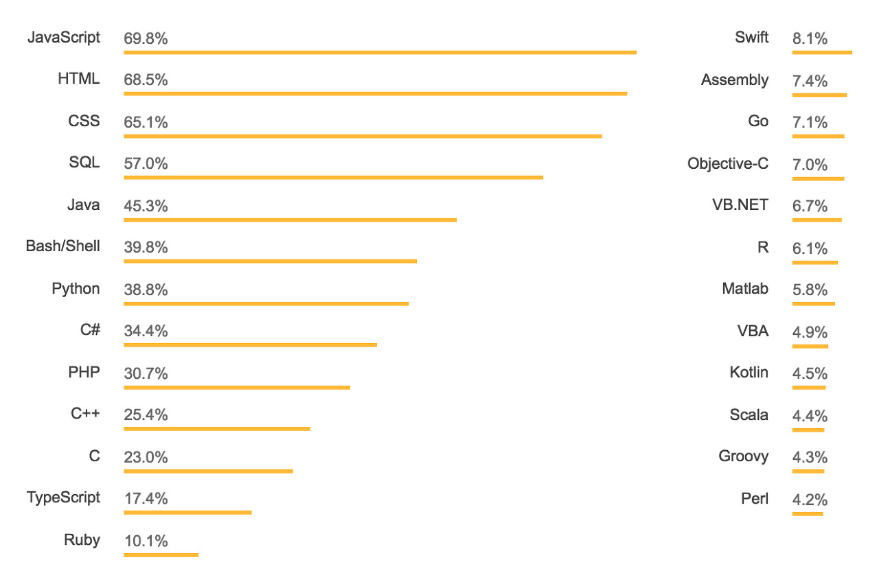 인기가 많은 언어일수록 커뮤니티가 크기 때문에, 도움을 받을 수 있는 자료들이 많고 가져다 쓸 수 있는 코드가 많다는 장점도 있다. 세계 최대 규모의 프로그래밍 커뮤니티인 스택오버플로우의 언어 점유율을 참고해보자.
