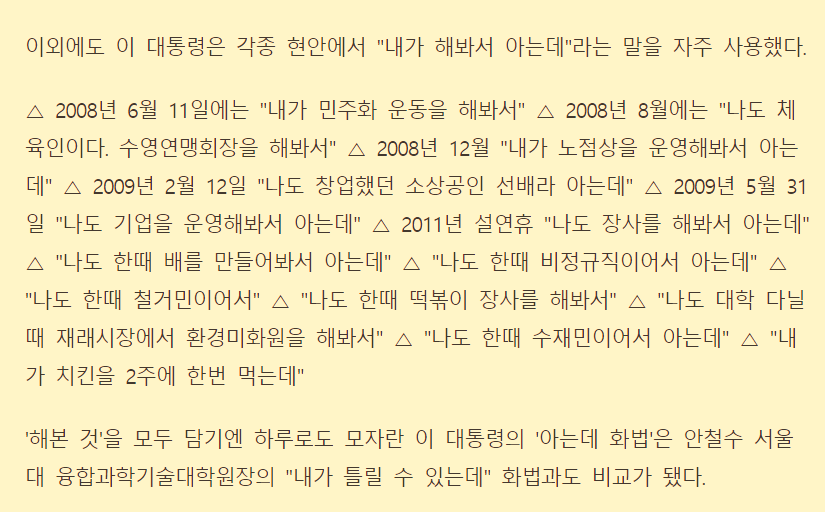 그 결과가 요즘 대한민국입니다. 지난 레퍼런스를 교훈삼는 것은 물론 좋습니다. 거듭 말하지만 그 레퍼런스의 맥락이 분명할 경우에 말이죠. 개인적인 경험도 교훈이 될 수 있습니다. 현 상황과 적절하다면 말이죠. 사이즈나, 성격이나, 상황이나, 업무적 측면에서 유사점이 많다면 리스크를 미리 방지할 수 있습니다. 하지만, '해봤는데...' 가 지니는 문제점은 이거죠. 그럼 해본 사람이 하셔야지, 한 사람은 본인이고 일은 딴 사람이 한다는 것.