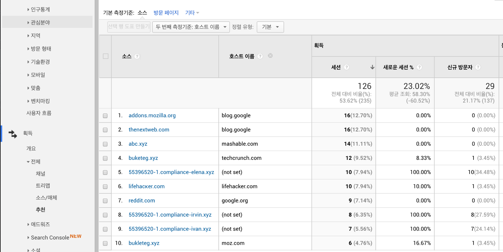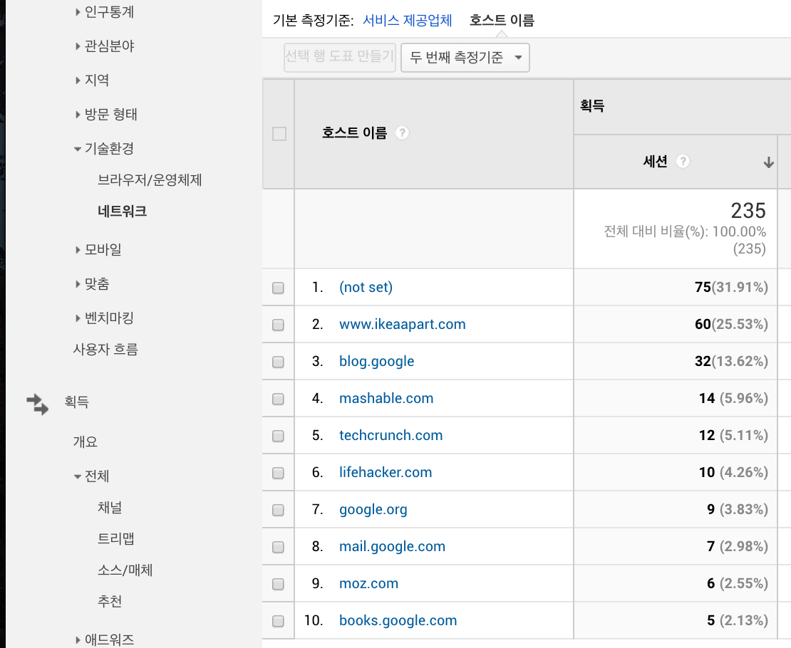 스패머는 랜덤하게 만들어진 GA ID를 사용하기 때문에, 해당 ID를 사용하는 사이트가 어떤 사이트인지 모른다. 그래서 hostname이 정해져있지 않거나, 유명한 사이트의 도메인으로 채워넣곤 한다. Referral report에서 2nd dimension을 hostname으로 놓고 보면, 스팸여부를 확인할 수 있다.