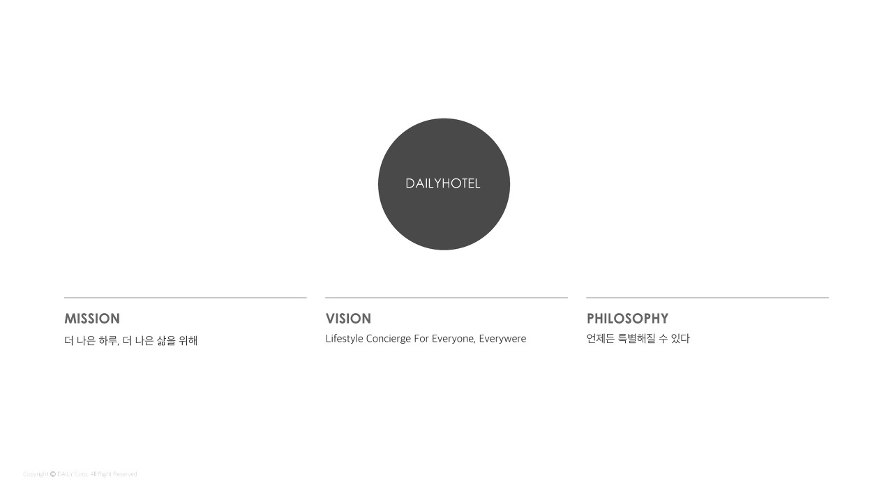 작년(2016년) 중순 즈음, 데일리호텔의 로고가 새롭게 리뉴얼되었습니다. 기존에 '데일리호텔'이라는 명칭에 맞게 손바닥 위에 호텔의 아이콘이 올라가 있는 심벌 형태였는데요. 점차 사업의 방향이 더 넓게 확장되고, 데일리가 가져가고자 하는 기업 이념을 보여주고자 기존 형태에서 많이 변형된 현재의 로고가 탄생했습니다.