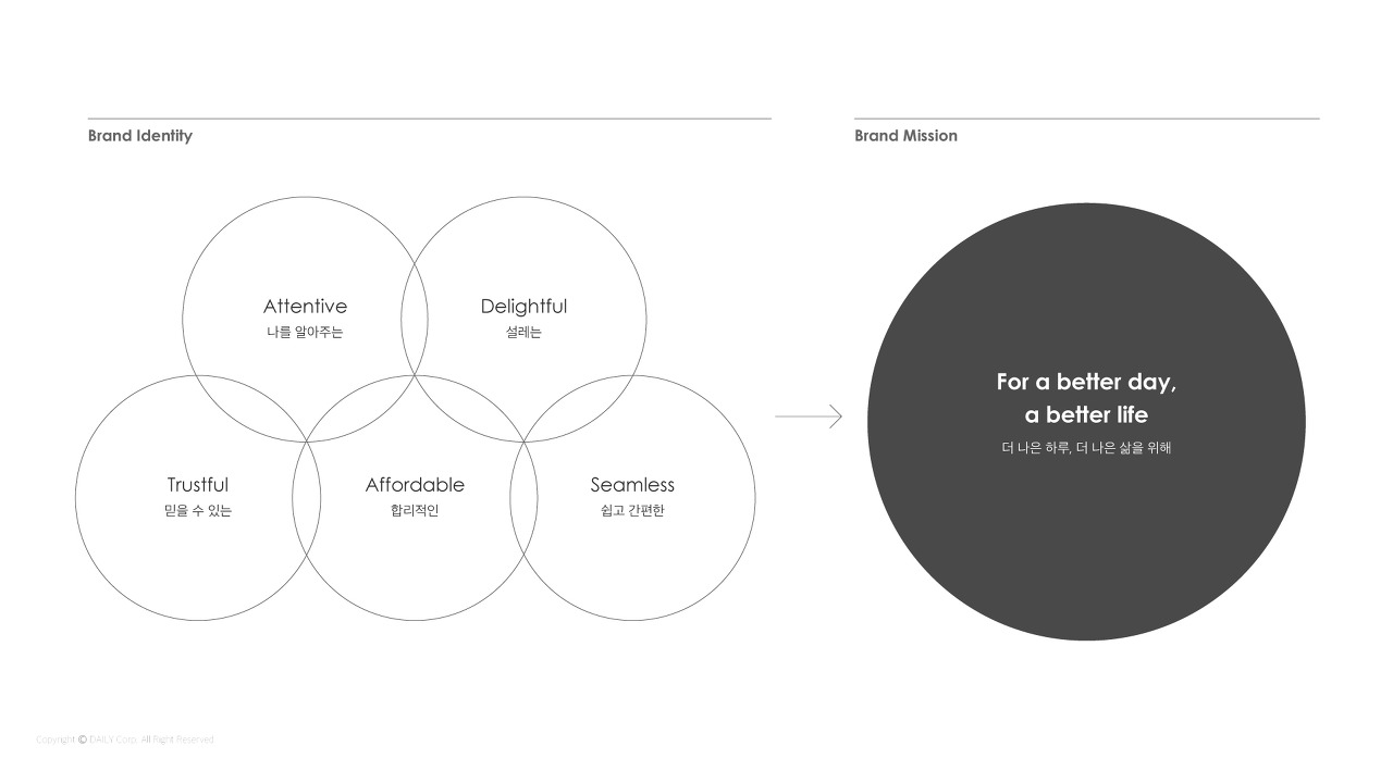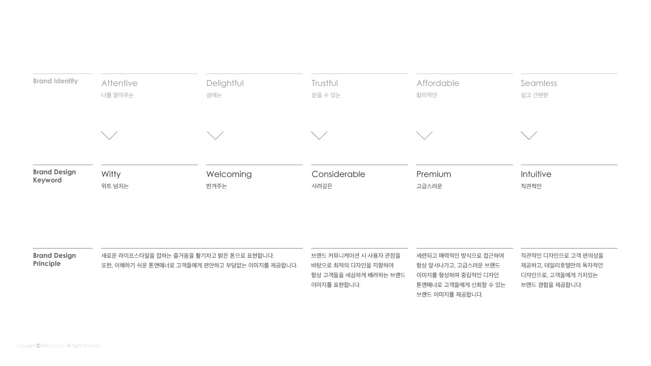 로고를 제작하기 이전에 우리는 데일리가 걸어온 길이 어디였으며, 나아가고자 하는 방향이 어디인지 확립해야 했습니다. 많은 데이터와 고객 경험 사례들을 분석해본 결과 결국 데일리는 '특별함'에 초첨이 맞추어져 있다는 걸 알게 되었어요.
