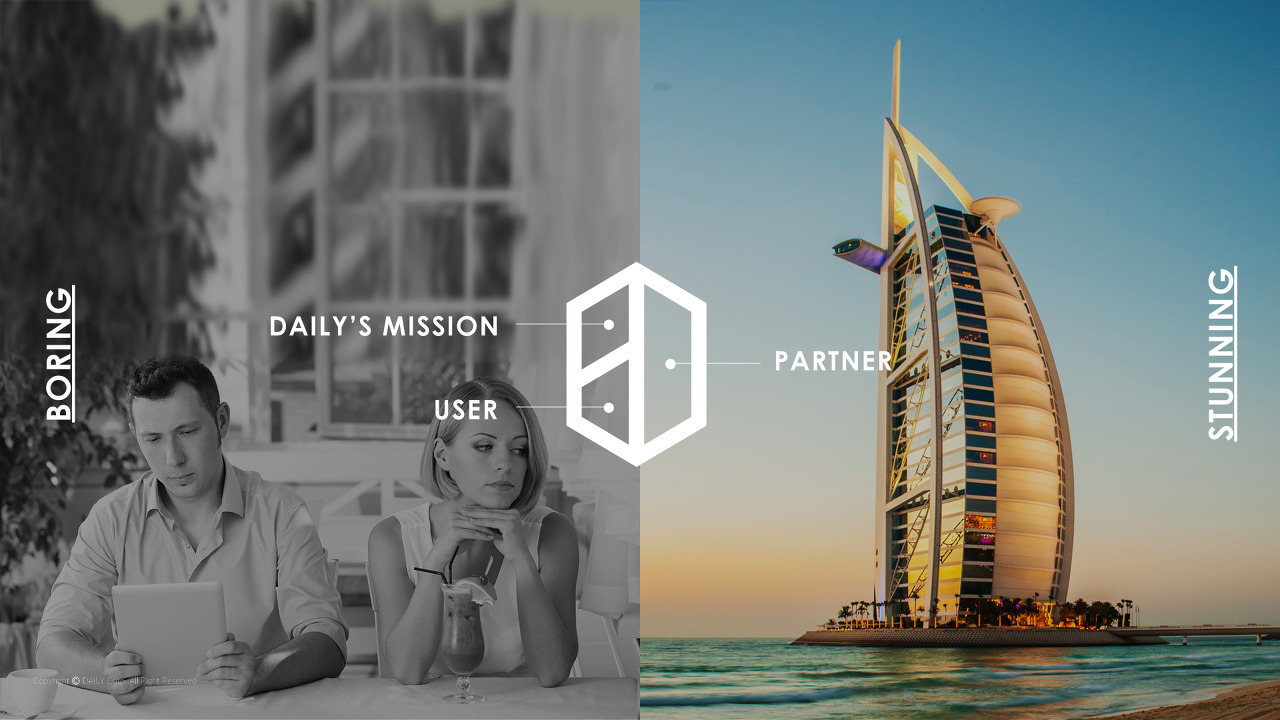 또한, 우리가 접하는 일상적인 문과, 특별함을 상징하는 호텔/레스토랑 문의 높이를 비교해보면 라이프스타일을 즐기기에 시간적, 금전적 부담을 느끼고 있기 때문에 쉽게 마음을 열지 못합니다. 여기서 데일리는 고객이 느끼는 부담적 마음의 문 높이를 채워줌으로써 라이프스타일에 한층 더 가까워질 수 있도록 조력자 역할을 해줍니다. 곧, 데일리의 미션인 '더 나은 하루, 더 나은 삶을 위해'를 이루기 위한 길이기도 하죠.
